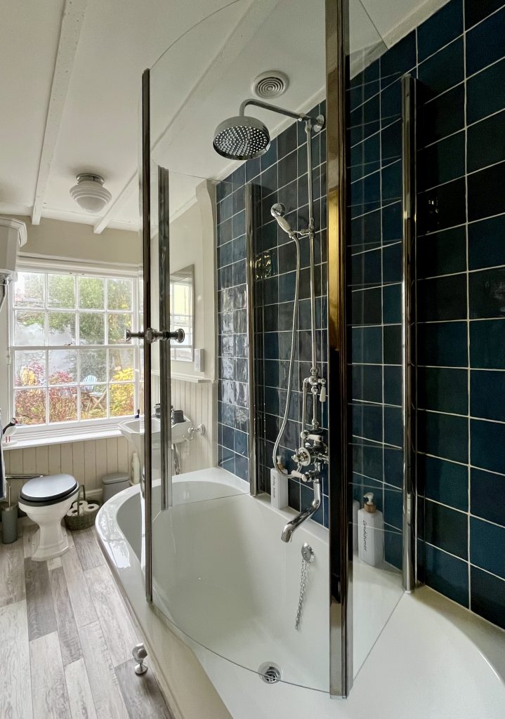 The bathroom has victorian-style fittings including a high level traditional toilet, pedestal basin and back-to-wall bath. There is a shower over the bath with a shower enclosure that folds back against the wall when not in use